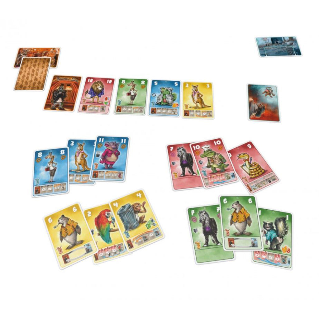 Beasty Bar is a fun "take that" card game about party animals. The players play animal cards into a line, and each animal has a special power that can manipulate the order of the cards.