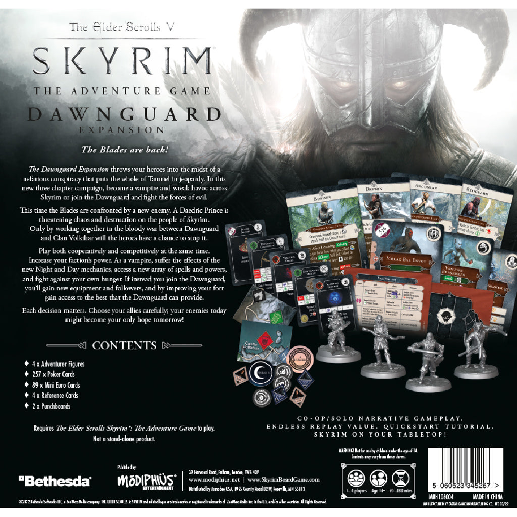 The Dawnguard Expansion throws your heroes into the midst of a nefarious conspiracy that puts the whole of Tamriel in jeopardy. In this new three chapter campaign, become a vampire and wreak havoc across Skyrim or join the Dawnguard and fight the forces of evil.