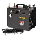Auto shut-off technology enables the compressor to shut itself off when not in use. This feature upgrade is known to lengthen the life span of the compressor motor because it reduces the workload of the motor over time. Two fully adjustable, mounted air regulators allow you to independently control air pressure to two airbrushes with two mounted gauges that displays precise air pressure. Two moisture filters prevent pulsation and trap condensation, delivering clean, dry air. Iwata Power Jet Pro has a 1/6 hp motor and a 2 liter air storage tank. The modern Iwata Power Jet Pro allows easy-access to the air intake filter for quick filter changes. The protective outer case adds durability and has two mounted airbrush holders so that you can conveniently rest your airbrushes when not in use.