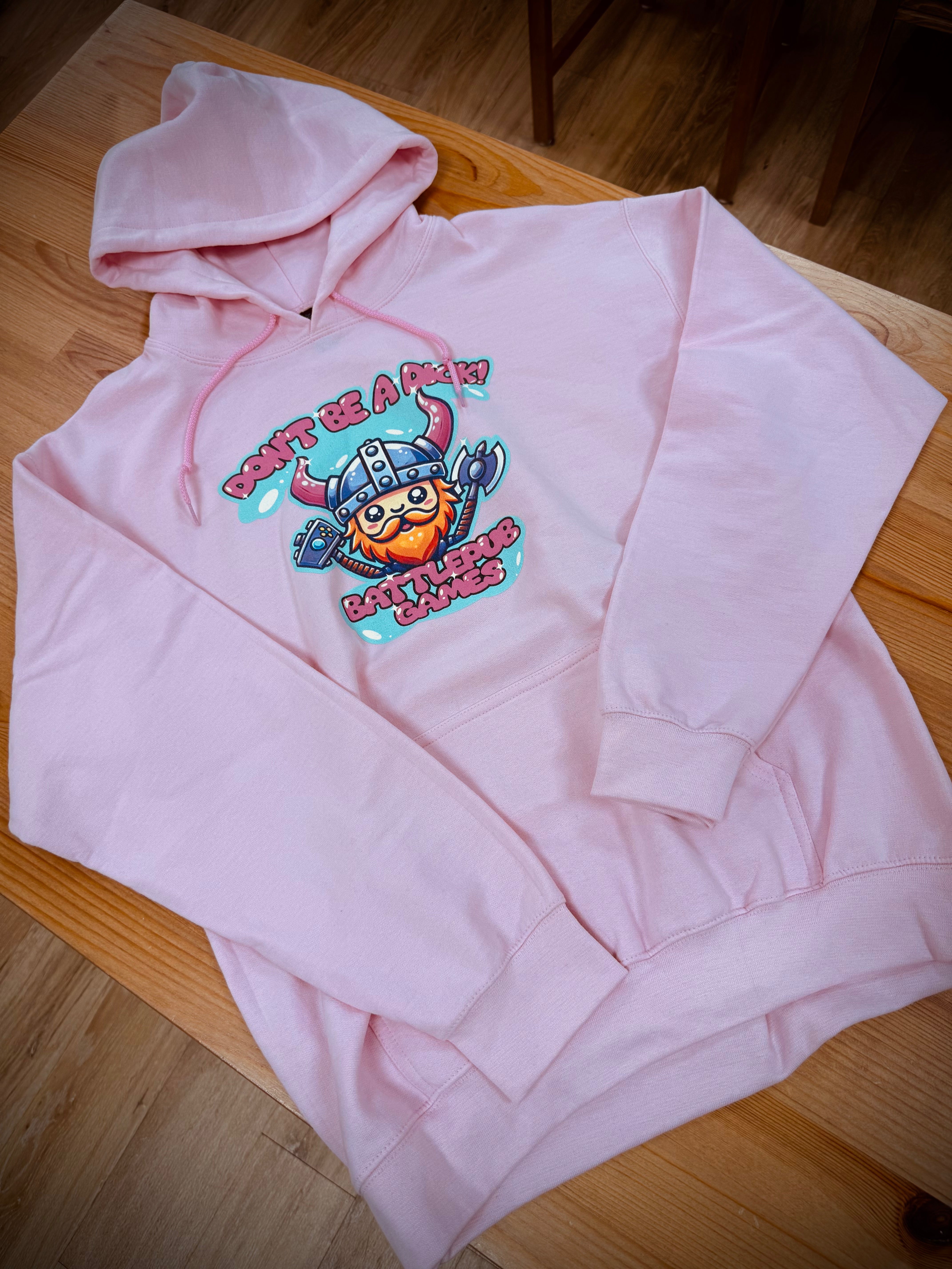 Show your enemies that you're hard and soft by reminding them to not be a dick in your favorite game store! In Hoodie Form!