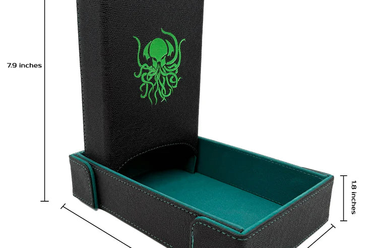 Unleash the cosmic power of the Dice Tray / Tower Bundle: Green Cthulhu. Inspired by the eldritch horrors of the deep, this set features a stunningly detailed Cthulhu design and a color scheme that brings the dark depths to life. The dice tower, adorned with a terrifying Green Cthulhu motif, ensures a controlled and satisfying roll, while the matching tray keeps your dice from straying into the unknown. With a luxurious green velvet and black PU finish, this bundle offers both style and function, making it perfect for fans of horror and tabletop gaming alike. Embrace the madness with this must-have bundle for your next RPG session.
