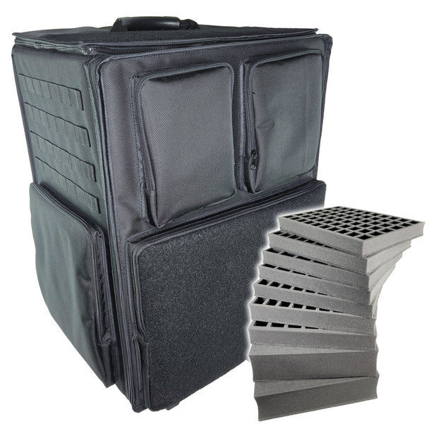 The P.A.C.K. (Personal Army Combat Kit) 1520XL will hold 21.5 inches (546 mm) of Battle Foam Large (BFL) size foam trays (15.5W x 12L"). Its rugged black, Ballistic Nylon exterior protects a hard plastic and wood interior built for strength and durability. This bag design has wheels for easy transportation.