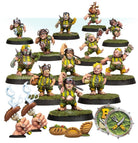 This multipart plastic kit contains all the components you need to assemble the Greenfield Grasshuggers, a Halfling team for use in games of Blood Bowl. You'll receive 2 Catchers, 2 Hefties and 8 Hopefuls, plus a roster sheet. Supplied with a transfer sheet, 2 sausage-wielding turn markers, 3 extra “balls”, and 12 Citadel 32mm Round bases featuring holes in which to place the ball.