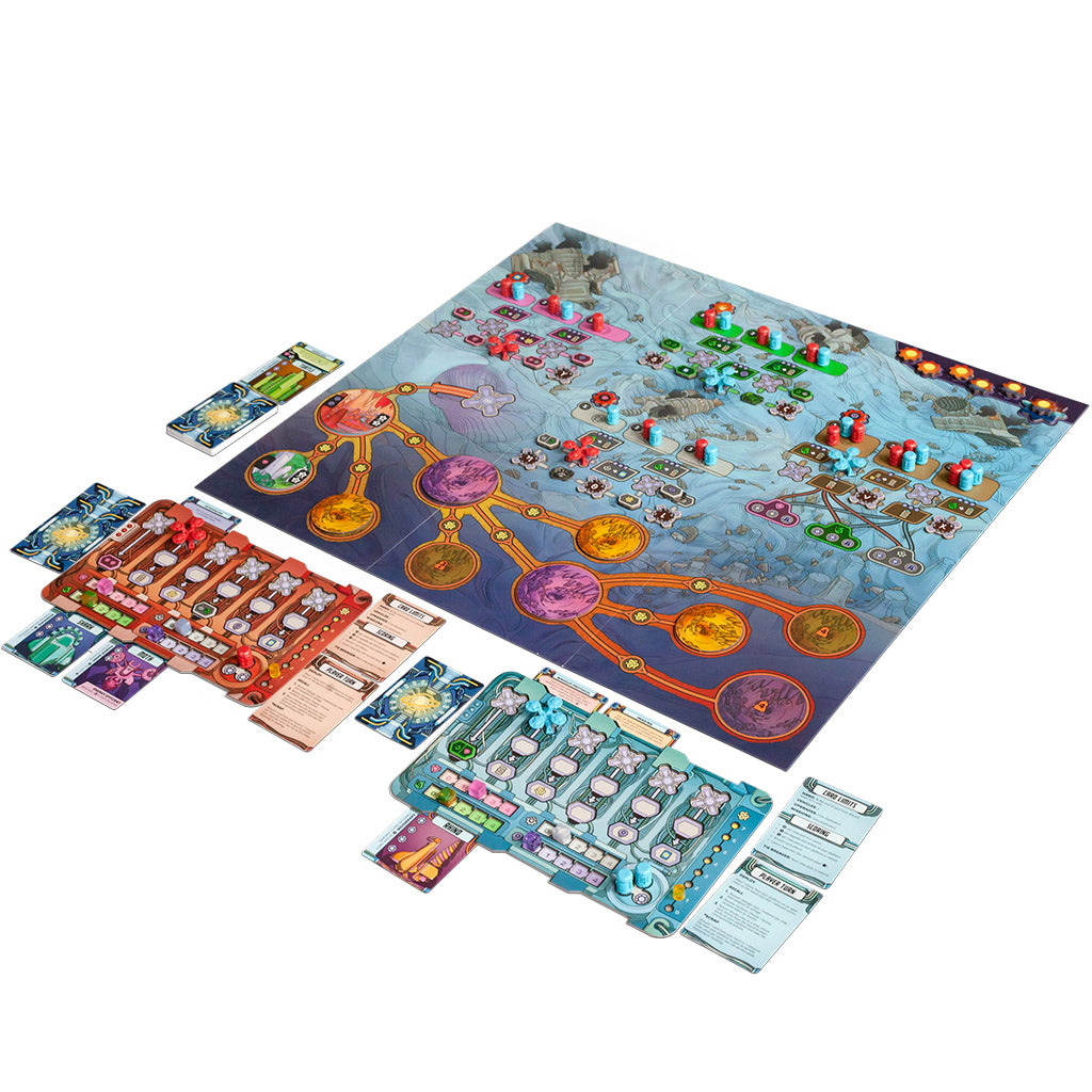 Tensions mount aboard your colony ship. An anonymous act of sabotage goes awry, and your vessel crash-lands on a frigid, uncharted planet in the distant reaches of space. Your only hope for survival is to take shelter in the planet’s warmer subterranean caverns before the sun sets. Send your drones to gather resources, build makeshift vehicles, and rescue your stranded crew before your opponents can obstruct your efforts. Even once you are safely below, other factions will be vying for control over the limited space. Salvage what you can and settle underground before the sun sets!